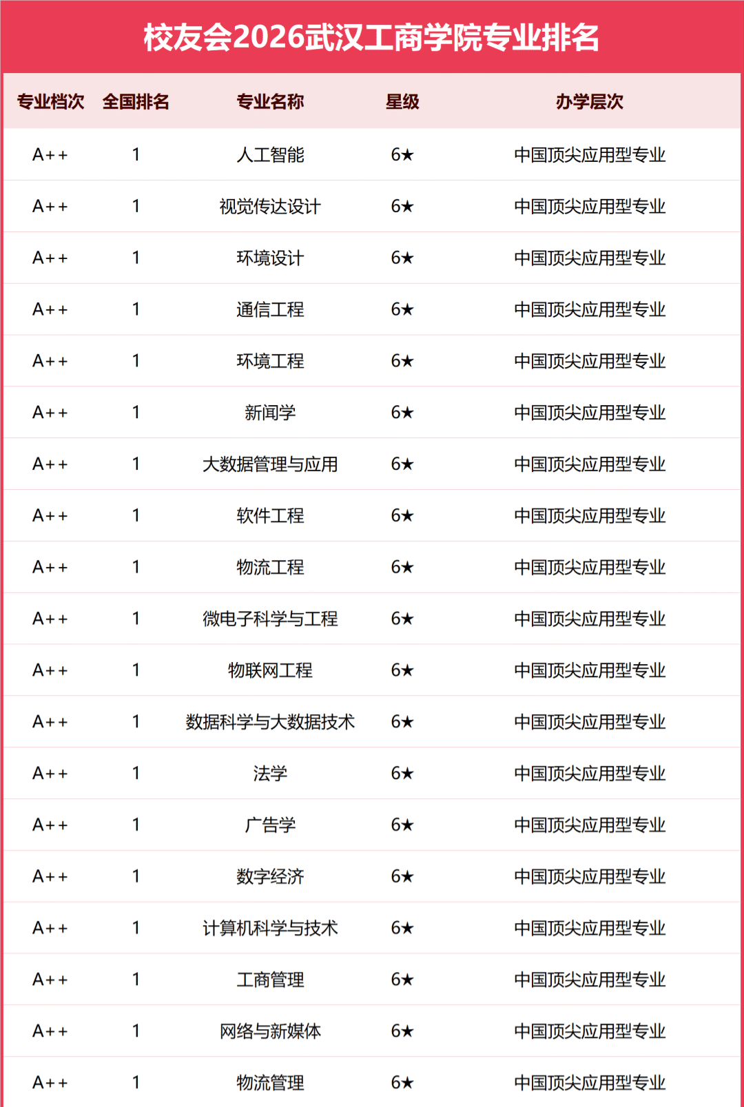 近日,全国第三方大学评价机构艾瑞深校友会网发布了2026中国大学一流专业排名。排名显示,在2026中国大学一流专业排名(应用型)中,武汉工商学院19个专业位列全国第一。