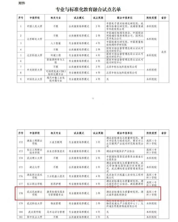 4月21日,国家市场监管总局联合教育部公布首批专业与标准化教育融合试点名单,武汉民政职业学院联合湖北省标准化与质量研究院、湖北省养老机构协会共同申报的“康养标准化服务与管理专业培养模式试点”成功获批。作为湖北省17所入选院校之一,该校成为省内在康养领域标准化教育融合探索的先行者,标志着学校在复合型人才培养与职业教育创新发展方面获得国家级权威认可。