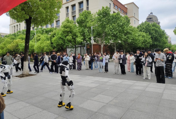 “长风破浪会有时的下一句?”“直挂云帆济沧海!”4月22日,在武汉商贸职业学院双创中心楼前,两台具身智能人形机器人“灵犀X2”化身“主考官”,摇头晃脑地吟出上句,学生们几乎不假思索地抢答。机器人俏皮地竖起机械拇指:“答对了!给你点个赞!”——欢声笑语瞬间点燃全场。