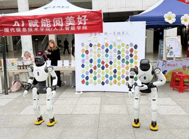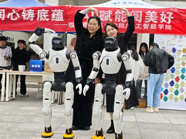 与以往知识竞赛、经典诵读等活动不同,今年该校现代信息技术学院/人工智能学院以“书香润心筑梦,AI赋能阅见美好”为主题,在第31个“世界读书日”来临之际,将人工智能与传统文化巧妙融合。两位特殊的“嘉宾”——机器人不仅能吟诗作对,还能即兴起舞、比心敬礼,成为全场最受欢迎的“互动搭档”。150余名学生现场参与,气氛热烈。