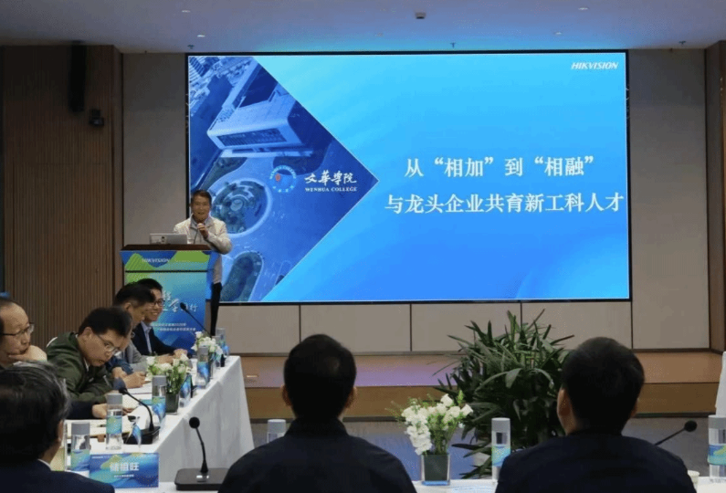 在海康威视武汉生产基地产教融合交流活动现场,文华学院作为优秀校企合作典型院校,校领导受邀作题为《从“相加”到“相融”,与龙头企业共育新工科人才》的专题报告。校领导特别以文华学院与海康威视的合作为例,回顾了自2022年以来与海康威视的合作历程,先后开设了两届海康威视星光班,为海康威视武汉生产基地培养输送多名本科生线长。2026年3月首次启动了面向制造专科的“工学交替班”项目,目前已有22名学生进入海康威视武汉生产基地“文华学院工学交替产线”开展实践教学。学生在企业导师与学校教师的联合指导下,实现了课堂知识向工程能力的有效转化。校领导表示,这种“学中做、做中学”的培养方式,有效破解了人才培养与产业需求脱节的难题。校企合作不能满足于“物理相加”,而要追求“深度融合”。文华学院以“从相加到相融”为理念,与龙头企业深度绑定,走出了一条“共育新工科人才”的特色路径。