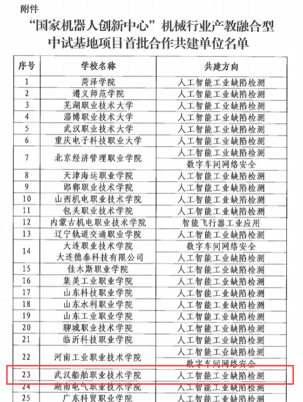 近日,机械工业教育发展中心公布《关于公布“国家机器人创新中心”机械行业产教融合型中试基地项目首批合作共建单位名单的通知》,武汉船舶职业技术学院成功入选首批合作共建单位,共建方向为“人工智能工业缺陷检测”。这标志着该校在深化产教融合、服务先进制造领域技术转型升级方面取得重要突破。