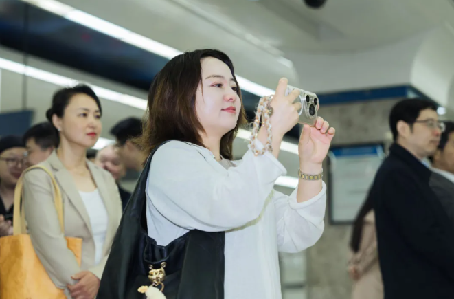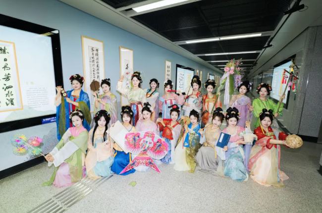 步履轻盈,衣袂飘飘。伴随着悠扬的古乐,同学们身着华美汉服,将古典服饰之美与传统文化韵味生动呈现。地铁站厅仿佛一条穿越千年的长廊,引得往来乘客纷纷驻足、举起手机记录。