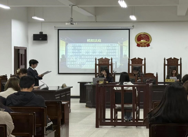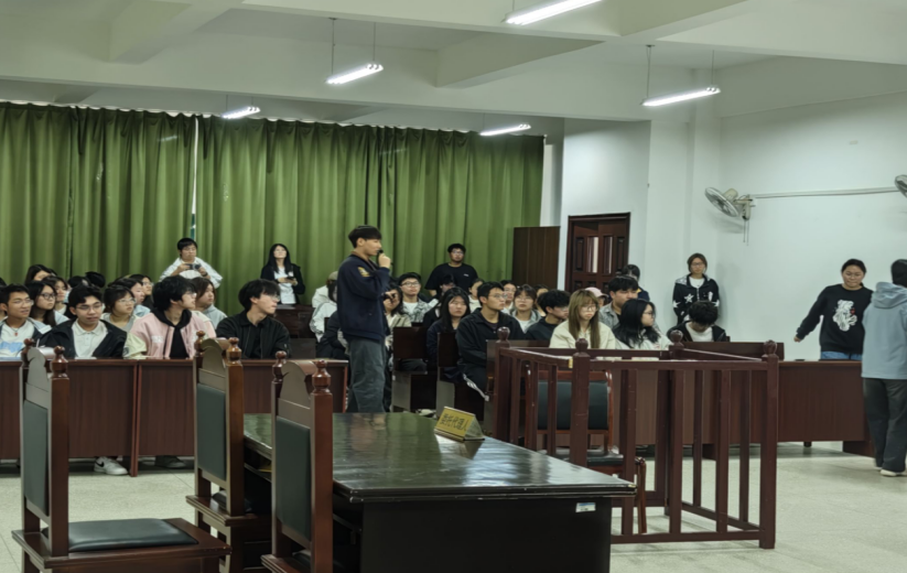 基础宣讲结束后,活动迎来最具感染力的模拟法庭沉浸式展演环节。学生先锋队成员化身审判人员、公诉人、法警、原被告等角色,完整还原庭审全流程,演绎了一例大学生因国家安全意识淡薄、不慎被境外势力利用、泄露敏感信息的真实改编案件。庄严的国徽、规范的庭审程序、代入感极强的案情演绎,让台下所有同学身临其境,直观感受到触碰国家安全红线的严重法律后果,真切体会到国家安全底线不可逾越、法治威严不容挑衅。