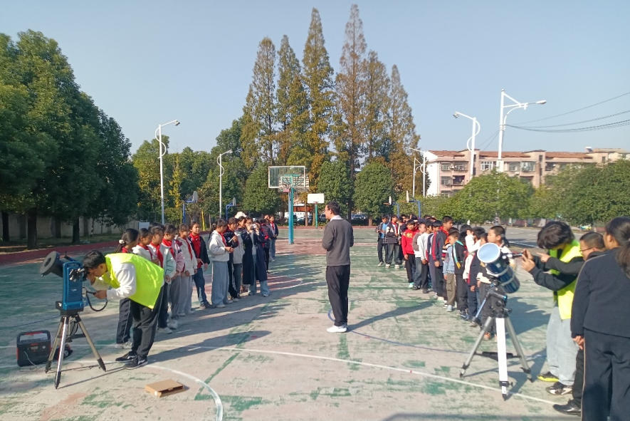 随后的互动游戏与实践操作环节,更让小朋友们沉浸其中。天文观测环节,小朋友们迫不及待地在天文望远镜后面排起了长队,湖北基础天文教育基地的科技志愿者们指导孩子们观测太阳。长长的队伍旁,好奇的提问此起彼伏。从望远镜中窥见的太阳黑子,瞬间点燃了小朋友们探索宇宙的热情,他们将志愿者团团围住,在答疑解惑中完成了一次星际穿梭。