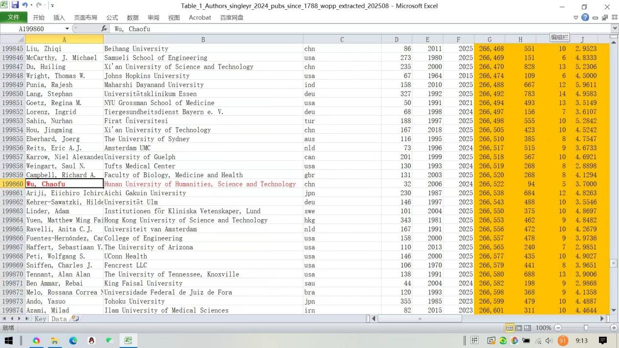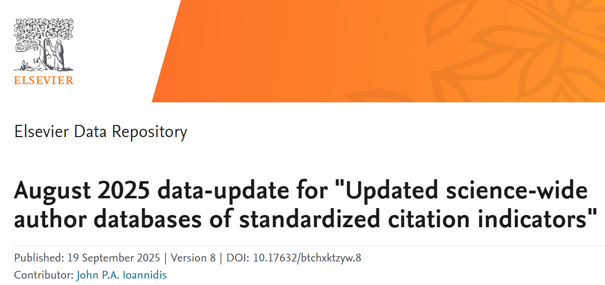 2025年9月19日,斯坦福大学和国际权威学术出版社爱思唯尔(Elsevier)共同发布2025年全球前2%顶尖科学家榜单。该榜单分为“终身科学影响力排行榜”和“年度科学影响力排行榜”两大部分,涵盖22个领域和174个子领域,从全球近700万名科学家中,通过基于其论文引用数、H因子、合著者修正的HM因子、单独或第一作者的文章引用数等综合参数,遴选出世界排名前2%的科学家。