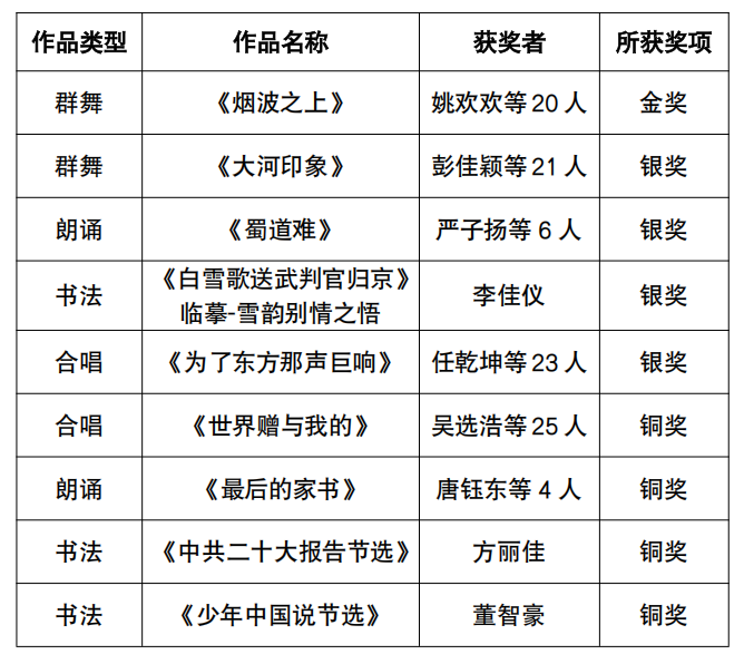 近日,团省委、省青联、省学联、湖南省教育厅、湖南省科学技术厅联合发布《关于举办第十一届湖南省青年文化艺术活动的通知》的通知,我校师生在第十一届湖南省青年文化艺术节中荣获金奖1项、银奖4项、铜奖4项,2名老师获评“最佳指导老师”,校团委荣获“优秀组织奖”。