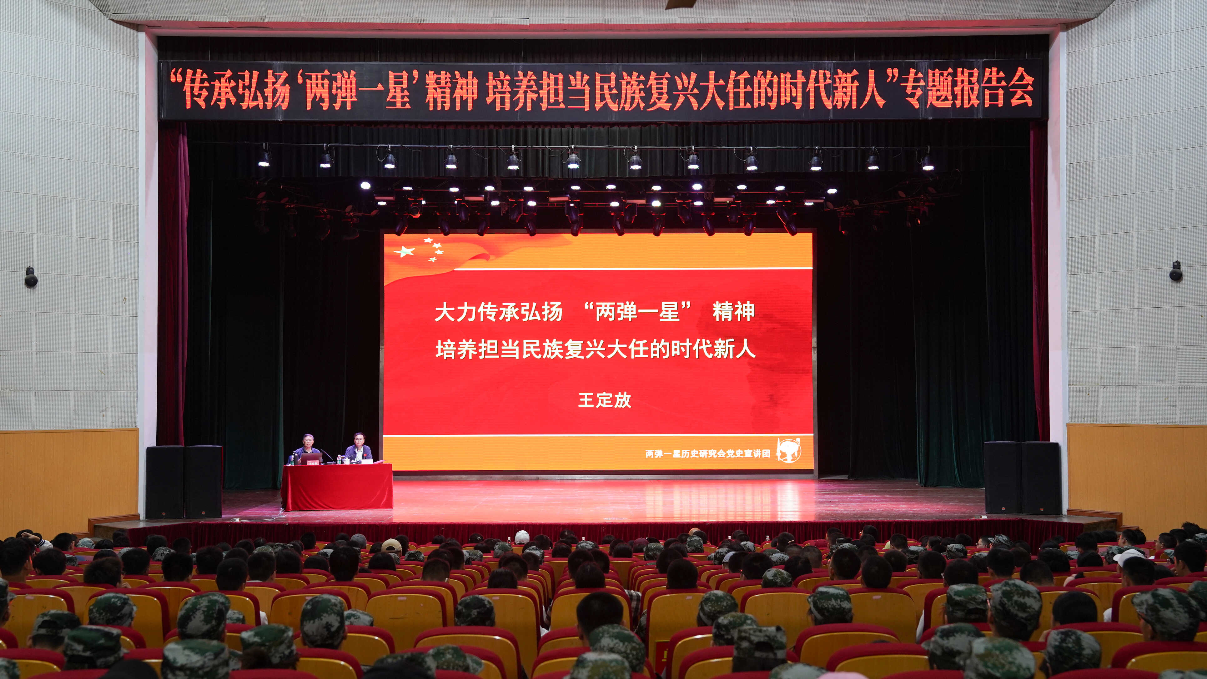 王定放从“铭记卓越历史功绩、铭记功勋英雄群体、铭记伟大时代精神”三个维度,系统阐述了伟大的“两弹一星”精神的丰富内涵与时代价值,指出这一精神是中华民族宝贵的财富,必须一代代传承下去,永续发扬。他强调,广大青年应当深入学习“两弹一星”功勋群体的赤子爱国情怀、艰苦奋斗本色、探索创新精神、团结协同风范,珍惜韶华、勤学笃行,努力增长才干、锤炼本领,在集体奋斗中成就事业、实现价值。