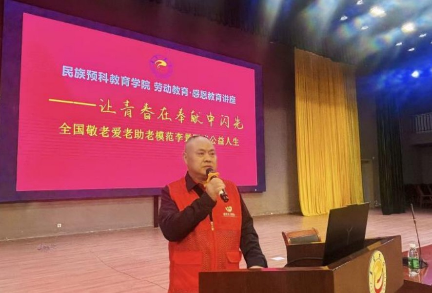 为深化劳动教育与感恩教育,引导青年学子树立正确价值观,11月7日下午,吉首大学民族预科教育学院在张家界校区大礼堂举办劳动教育与感恩教育专题讲座。本次讲座特邀全国敬老爱老助老模范人物、湖南省最美志愿者、张家界市道德模范,张家界市武陵源区景军义工服务队队长李景军主讲。全院近1000名师生参加,现场座无虚席,气氛庄重热烈。