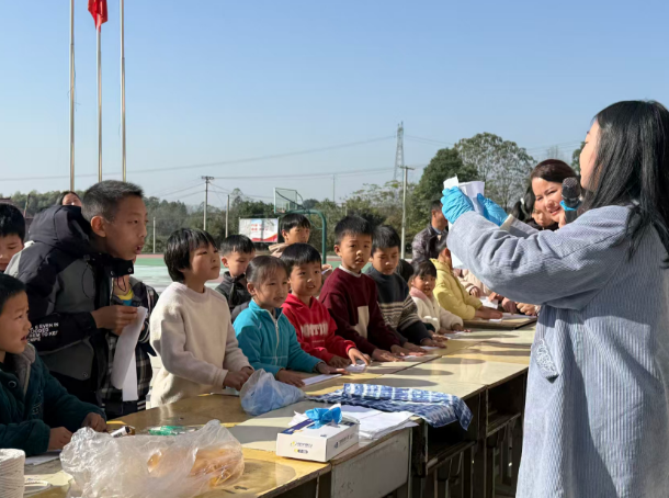 在七里山学校的活动现场,另一番温馨场景正在上演。数字设计学院的党员教师们化身“非遗传承人”,为该校二至六年级的学生带来了别开生面的蓝印花布扎染手工课。课堂上,教师们耐心细致地向孩子们讲解蓝印花布这一非物质文化遗产的历史渊源、艺术特色,手把手教大家掌握扎、缝、捆、绑等扎染技巧。孩子们兴致勃勃地投入创作,手中的白布在橡皮筋、夹子的作用下变幻出多样形态,期待着染料浸润后的惊喜。当一块块独具创意的蓝印花布作品新鲜出炉时,孩子们的脸上洋溢着自豪与喜悦。此次非遗手工教学,不仅让孩子们感受了传统工艺的魅力,更在互动中弥补了他们情感陪伴的缺失,让温暖在指尖传递。