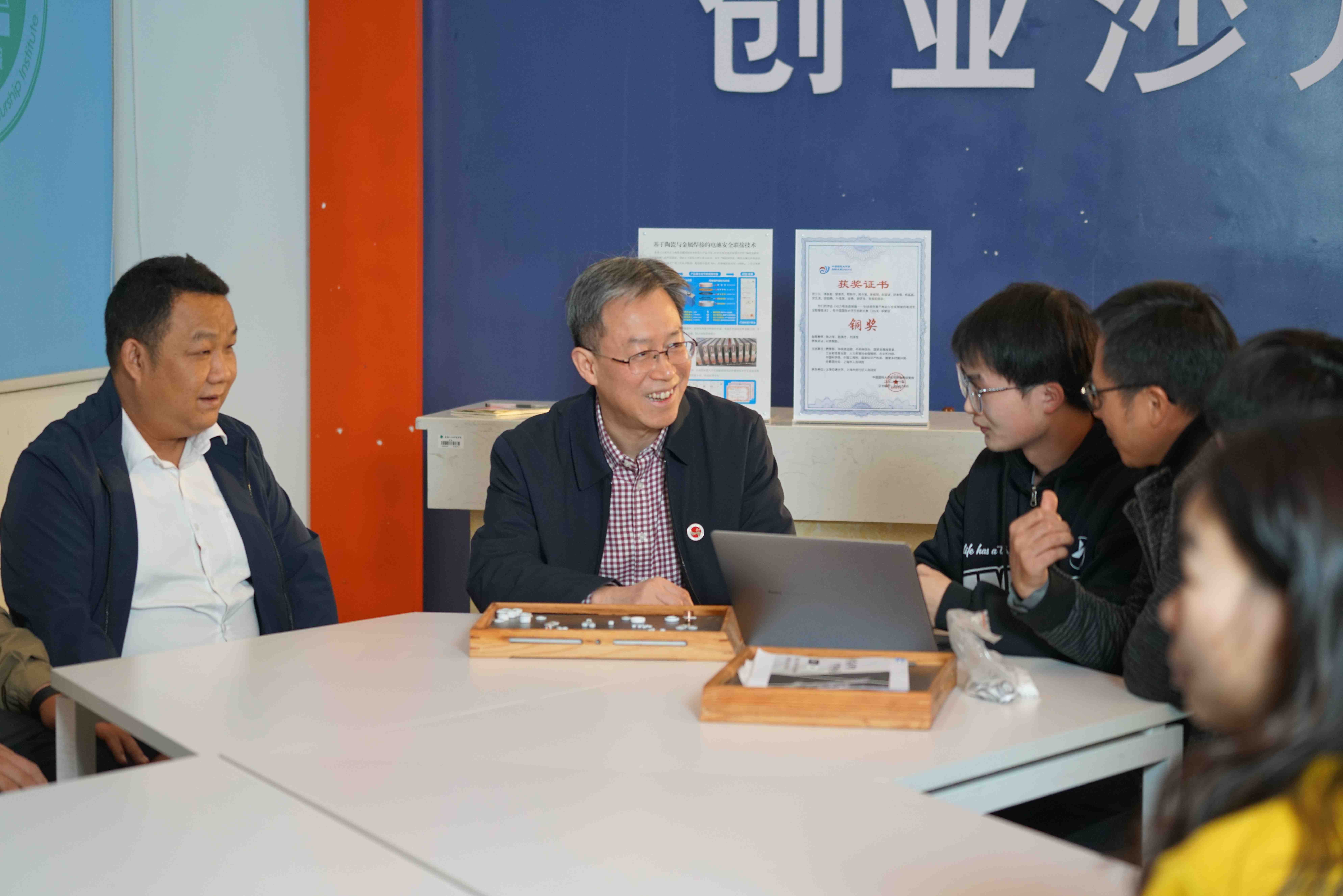 随后,胡凯波走进创新创业学院,与贺少云锂电池团队、龚鑫水射流团队展开交流。他重点了解两个创新创业团队项目在“金种子杯”获奖、技术研发、市场对接、资金支持等方面的情况。交流过程中,胡凯波对贺少云团队聚焦陶瓷与金属焊接技术、攻克传统技术痛点、研发环保高效焊接技术的成果给予高度评价。他表示,创新创业青年是校园里的先锋力量,这份敢闯敢试、攻坚克难的锐气,正是青春最美的模样。对于龚鑫水射流团队研发新型振荡气力泵、解决滨海砂矿开采行业效率低、能耗高、污染重等痛点的创新实践,胡凯波同样给予充分肯定,并鼓励团队继续深耕技术创新,依托娄底材料谷建设和区域产业优势,加快科研成果落地见效,让青春智慧在服务地方经济社会发展中绽放光彩。