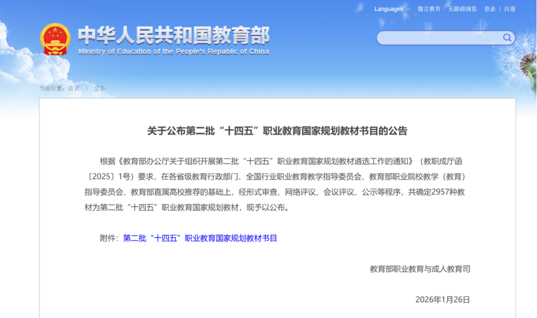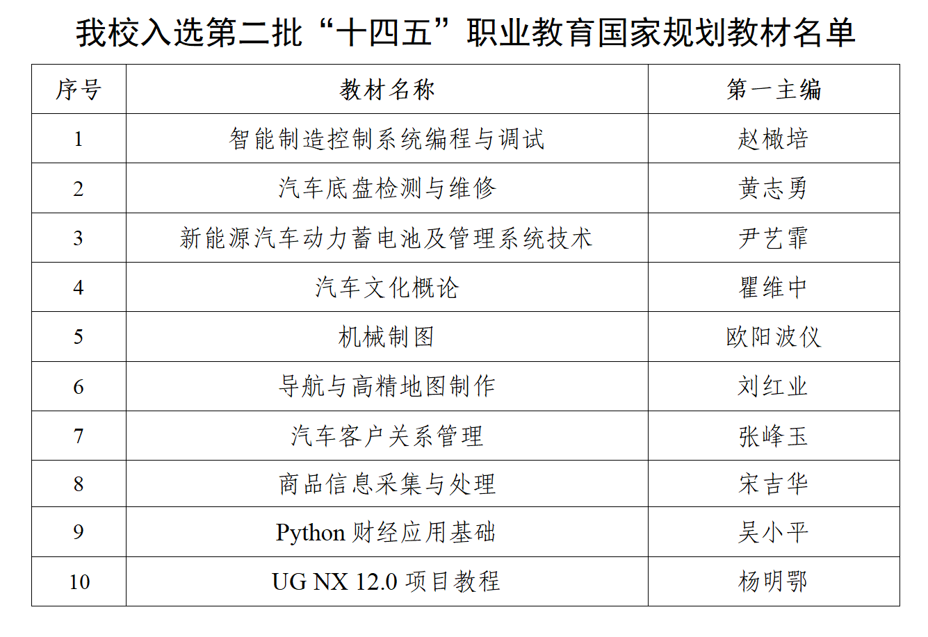 近日,教育部职业教育与成人教育司发布《关于公布第二批“十四五”职业教育国家规划教材书目的公告》,湖南汽车工程职业大学共有10部教材成功入选,入选数量位居全国与湖南省职业院校前列,充分彰显了该校在对接产业发展、深化教学改革、推动教材建设方面的综合实力与显著成效。