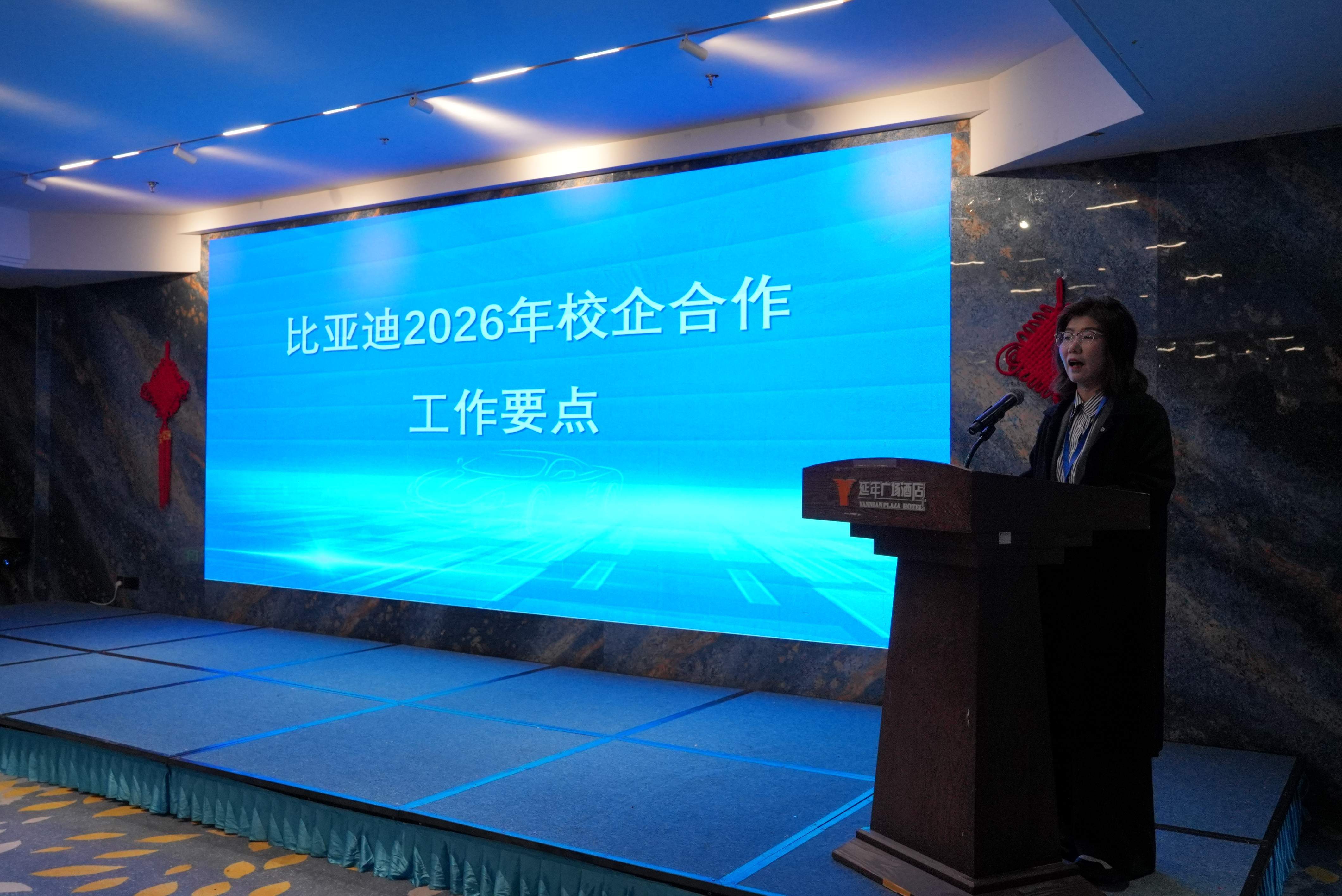 在上午主持的会上,欧阳波仪代表湖南汽车工程职业大学向与会嘉宾表示热烈欢迎,强调本次会议旨在“交流经验、凝聚共识、共谋发展”。首先,会议以视频形式回顾了2025年各领域工作成果。随后,由中国教育科学研究院韩倩博士传达高技能人才集群培养计划最新政策动态;比亚迪股份有限公司校企合作经理张搏搏解读了公司参与新能源汽车领域高技能人才集群培养计划相关情况及2026年校企合作规划;河南交通职业技术学院校长徐红玉介绍了该校与比亚迪共建产业学院的实践经验。长春汽车职业技术大学、北京科技职业大学、深圳职业技术大学等13所试点院校代表依次发言,分别阐述了各校在高技能人才集群培养工作方面的创新举措与成效。