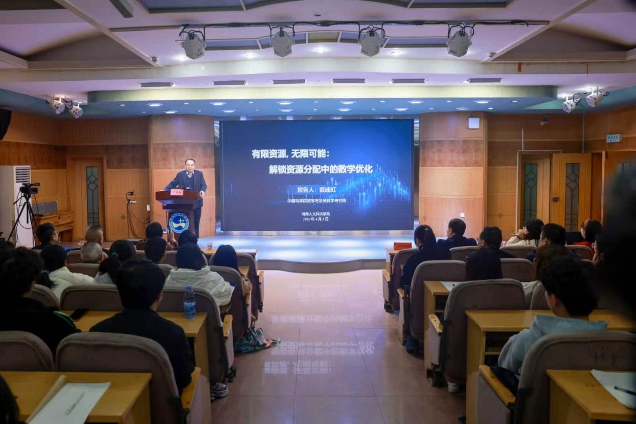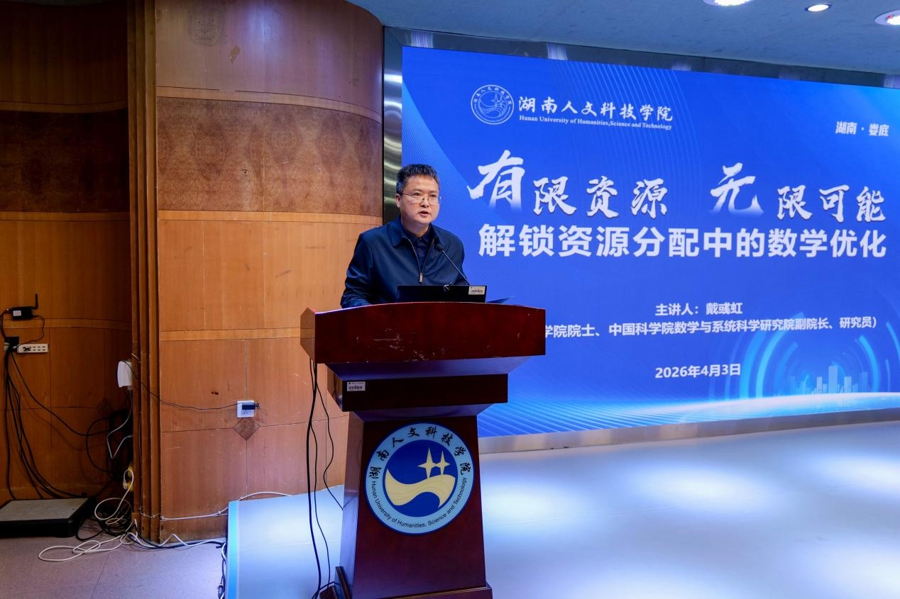 4月3日上午,中国科学院院士、中国科学院数学与系统科学研究院副院长戴彧虹研究员应邀莅临湖南人文科技学院,在养根楼报告厅作题为“有限资源,无限可能:解锁资源分配中的数学优化”的科普讲座。党委委员、副校长张细政主持报告会。