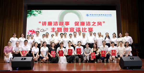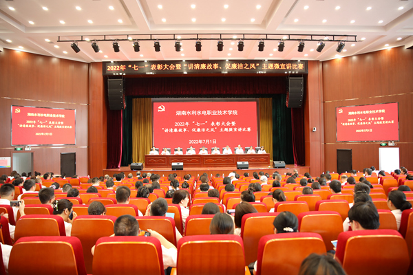 “这个伟大的政党,从最初只有50多名党员,到发展成为拥有9671.2万名党员的世界第一大执政党,依然风华正茂、朝气蓬勃,是中国特色社会主义的坚强核心,始终得到了人民群众的真心爱戴与拥护……”湖南水利水电职业技术学院党委书记钟建宁的讲话铿锵有力地回荡在学校礼堂。7月1日上午,在举国上下庆祝建党101周年和香港回归25周年之际,湖南水利水电职业技术学院举办了庆祝“七.一”表彰大会暨“讲廉洁故事,促廉洁之风”主题微宣讲比赛。全体教职工和退休党员代表参加会议。