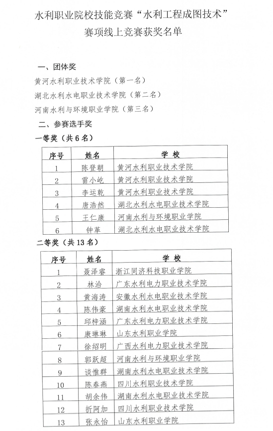 近日,全国第十五届全国水利职业院校技能竞赛“水利工程成图技术”赛项圆满落幕。湖南水利水电职业技术学院在大赛中斩获了3个二等奖,团队积分排名全国第四,获奖率和比赛成绩再创新高。