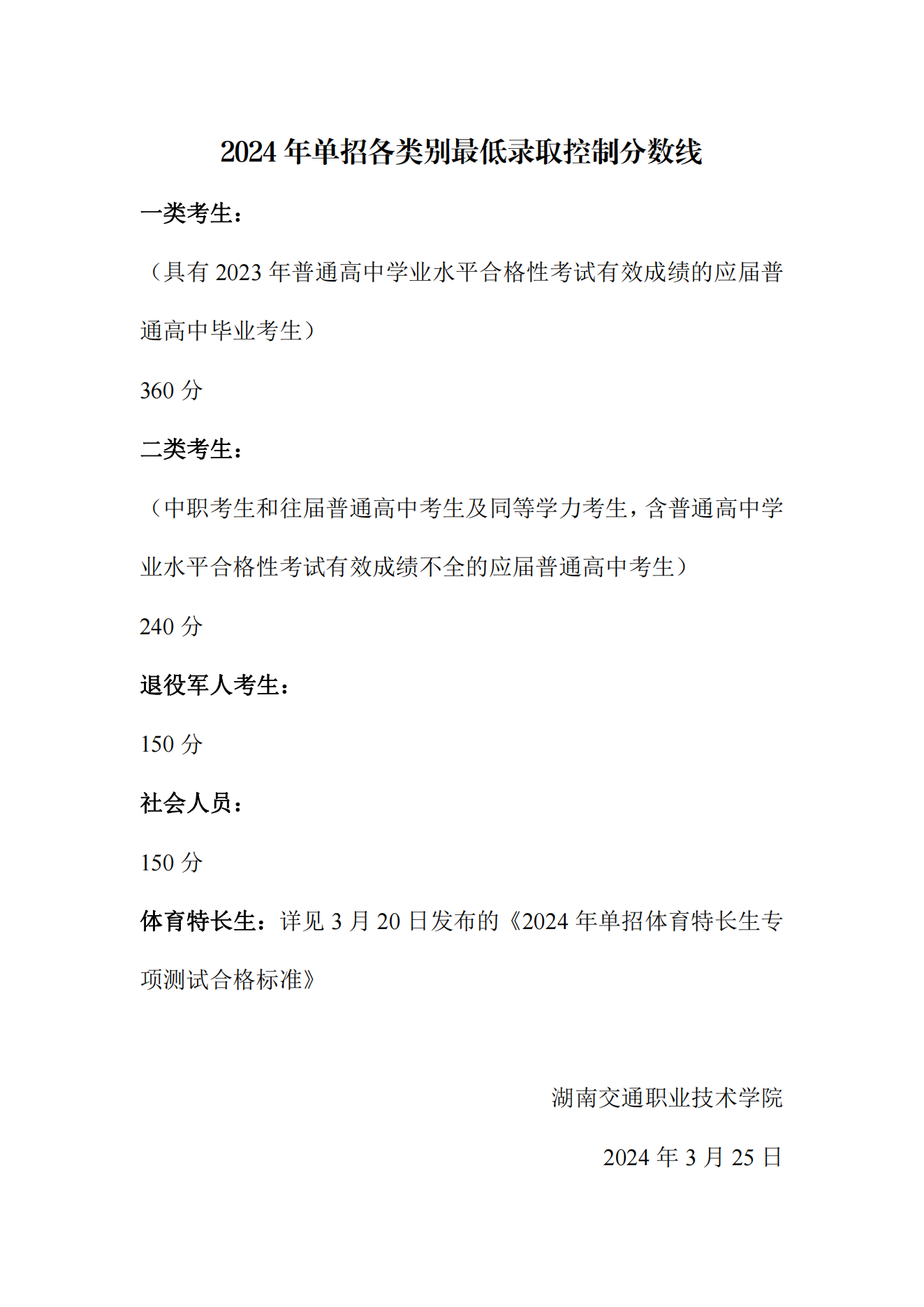 湖南交通职业技术学院2024年单招各类别最低录取控制分数线