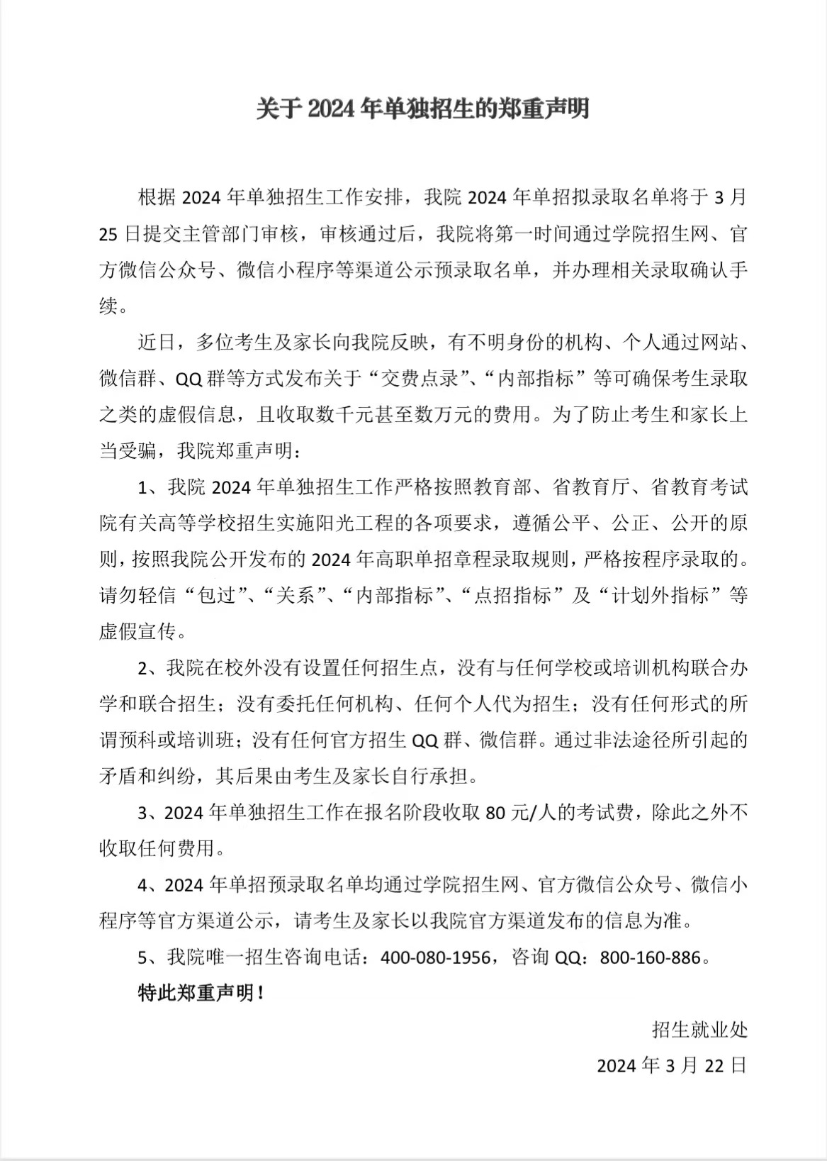 湖南交通职业技术学院关于2024年单独招生的郑重声明