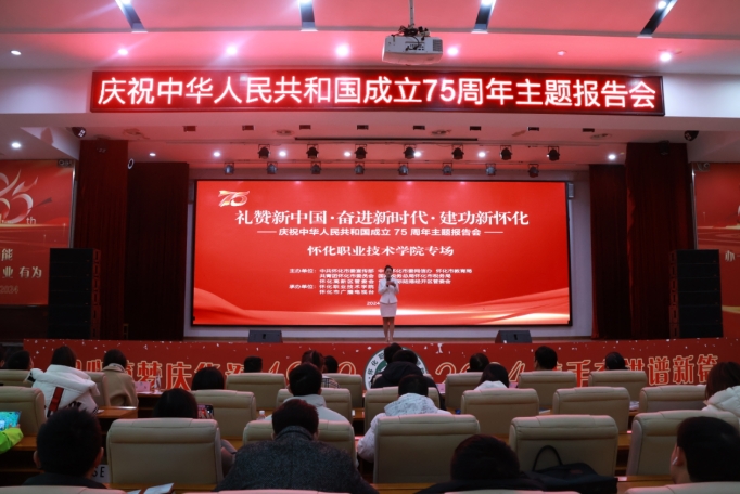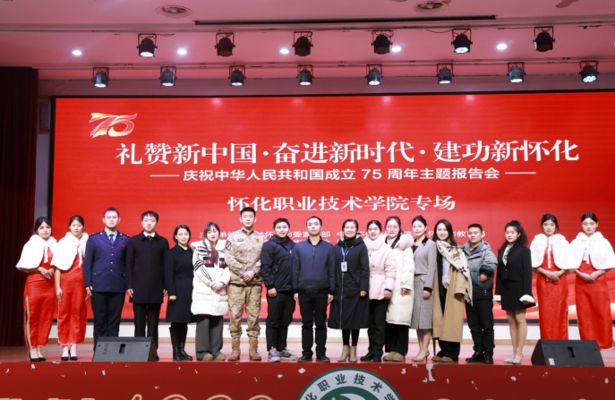 12月26日上午,"礼赞新中国·奋进新时代·建功新湖南"——怀化市庆祝中华人民共和国成立75周年主题报告会高校专场活动在怀化职业技术学院隆重举行。怀化职业技术学院党委委员、副校长廖冬云,党委委员、宣传统战部部长刘鑫,以及市委宣传部宣教科科长骆进出席活动。