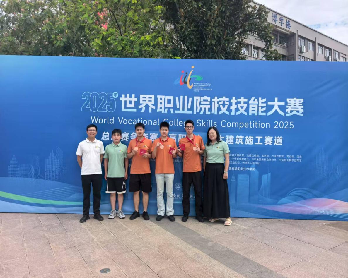8月26日至31日,2025年世界职业院校技能大赛总决赛争夺赛“土木施工赛道”高职组赛事在安徽职业技术大学举行。本次比赛汇聚了全国156支顶尖参赛队伍,近800名优秀学子同台竞技。王云来、杨家轩、肖飞三位同学在陈文萃、彭子茂老师指导下,从数字化、智能化角度,紧扣主题,勇于创新,斩获铜奖,实现装配式建筑方面的国赛突破。
