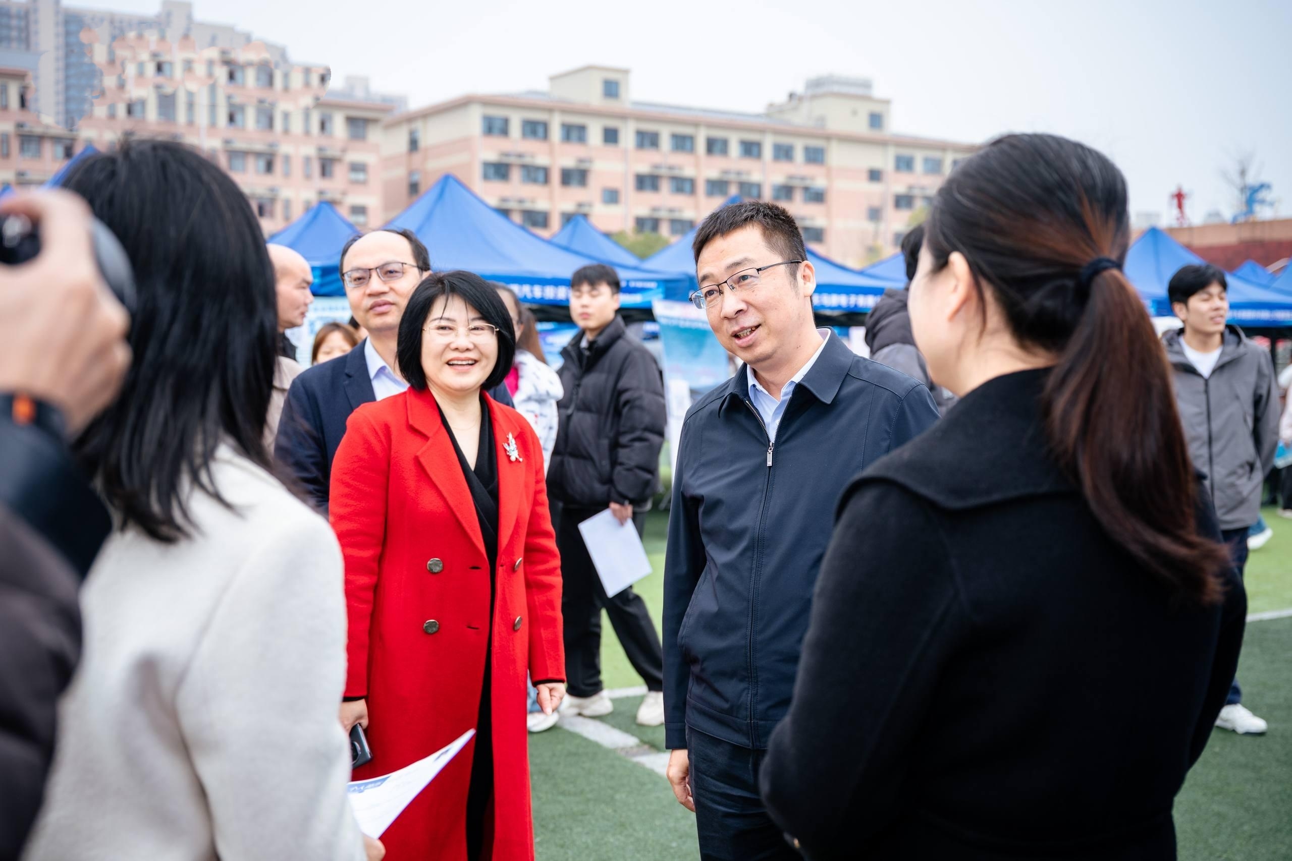 学院党委书记潘军率全体校领导深入招聘会现场,与企业代表亲切交流,了解用人需求与市场动向,并就深化校企协同育人、拓展就业渠道等议题交换意见。校领导还与参会毕业生面对面交谈,鼓励大家树立信心、积极应聘,在实践中定位职业方向。
