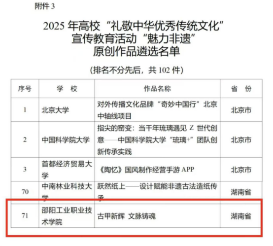 此次活动竞争激烈,经过严格评审,全国从“数智未来”焕活传统文化案例、“烽火记忆”高校红色故事、“魅力非遗”原创作品三个类别中遴选产生了305件优秀作品。邵阳工院作品《古甲新辉 文脉铸魂》脱颖而出,邵阳工院成为湖南省获得这一殊荣的两所高校之一,也是湖南省唯一入选的高职院校!教育部将通过中国教育电视台、全国高校思想政治工作网等平台进行专题宣传展示。