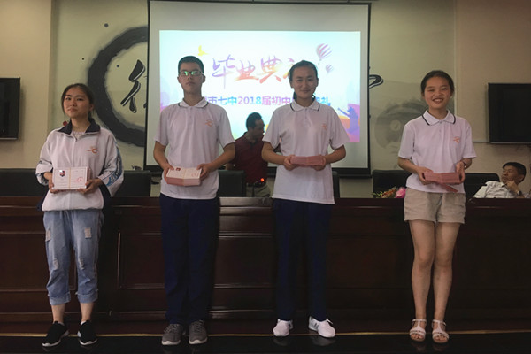全体初中毕业生宣誓:“忠孝历练品行,勿忘父母辛累;信念成就理想,勿忘恩师教诲;身心奉献国家,勿忘母校栽培。名校七中,厚德博雅,毕业临行,诚谢师恩,心系母校,永铭校训。”
