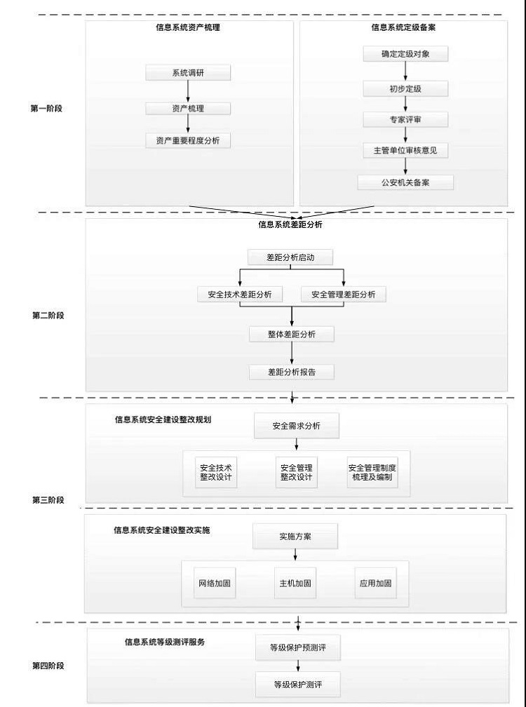 实施等级保护2.0的工作流程,参见图1。四个阶段的工作落实如下: