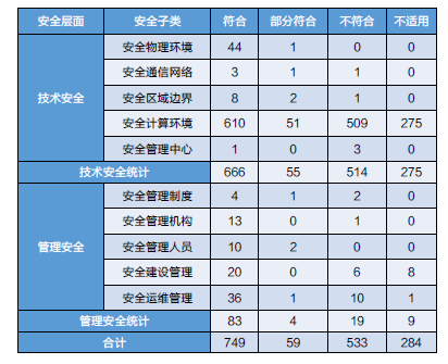 具体到差距分析的实施中,结合风险评估理论,从技术安全和管理安全两个维度对安全物理环境、安全通信网络、安全区域边界、安全计算环境、安全管理中心、安全管理制度、安全管理机构、安全管理人员、安全建设管理、安全运维管理十个层面进行了评估和分析,并通过漏洞扫描、渗透测试等方式增强评估的质量和深度,给出“符合-部分符合-不符合-不适用”四项评定结论。