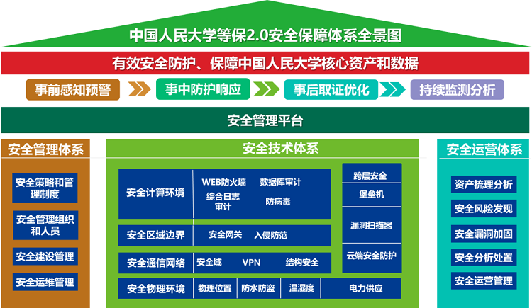 在安全技术层面,我们分析了等级保护2.0差距分析中发现的问题,结合中国人民大学的安全现状和需求,进行了针对性整改,具体包括: