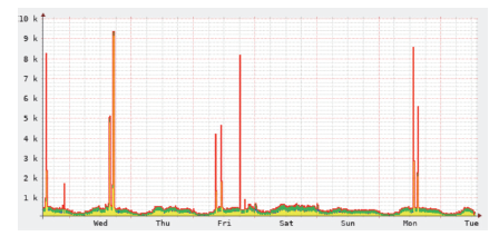 图1为2019年7月30日至8月6日的权威DNS流量图,其中高峰为攻击发生流量,可以看到这一周的工作日经常发生攻击。