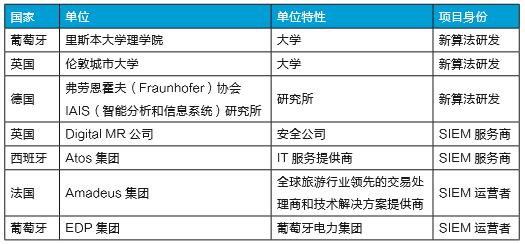 安全信息和事件管理系统(Security Information and Event Management, 简称SIEM)是现代安全运营中心(SOC)的重要工具,目前SIEM在进行事件收集、数据存储和威胁报告的手段和方法上仍然有很多能力限制,为了增强SIEM的能力,欧盟的地平线计划(Horizon Plan)资助了一项名为安全信息和事件管理系统的多样性增强项目(Diversity Enhancement of Security Information and Event Management,后文简称DiSIEM项目),该项目从2016年到2019年开展了为期3年的研究与实践,共获得400万欧元的资助。DiSIEM项目共有七个参与组织(见表1)。