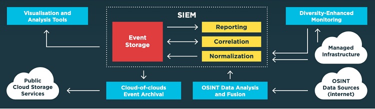DiSIEM项目并不希望设计一套全新的SIEM系统,而是希望对现有的SIEM系统进行增强,包括:对各类安全和监控设备的配置评估;新的面向应用的滥用监测方法;基于安全云后端的事件长期存储系统。