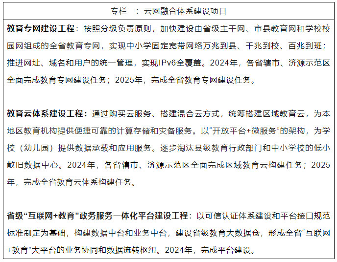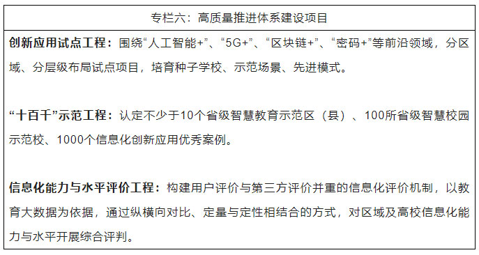 “十百千”示范工程:认定不少于10个省级智慧教育示范区(县)、100所省级智慧校园示范校、1000个信息化创新应用优秀案例。