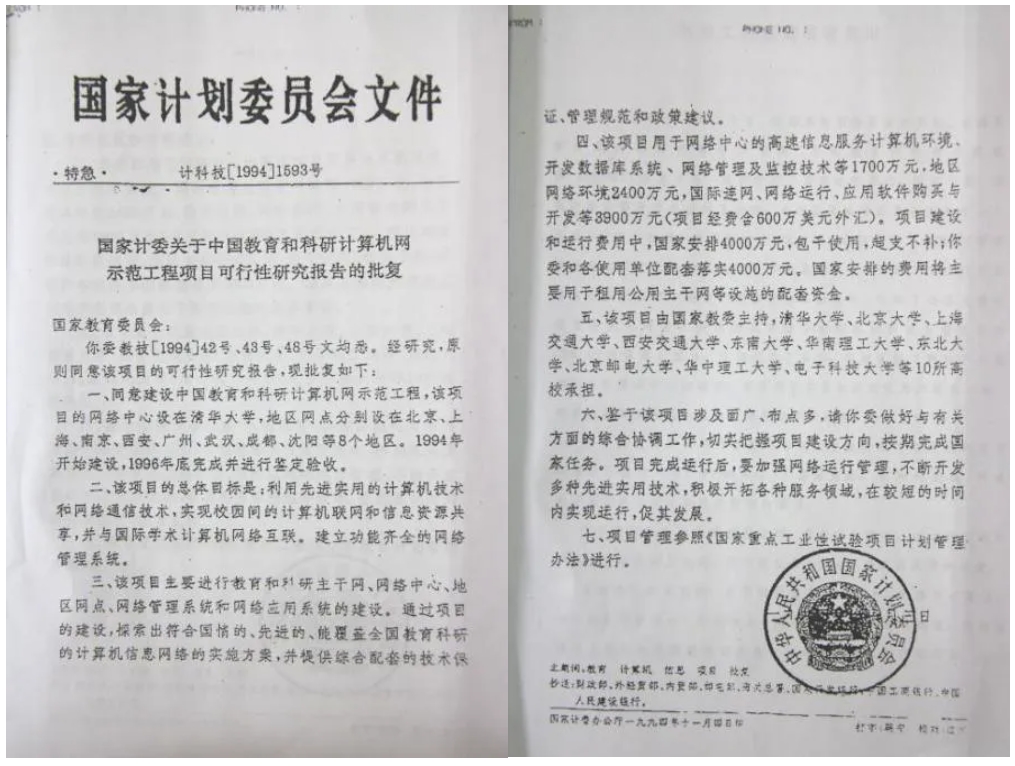 9月,在国家教委主持下,200多页的《中国教育和科研计算机网示范工程项目可行性研究报告》通过了由叶培大院士为首的专家委员会的论证,并由国家教委正式上报国家计委申请立项。这是我国高等教育与科研领域在网络建设方面描绘的最初蓝图。