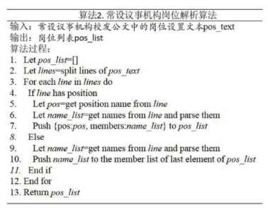 学校发布的关于成立某议事协调机构的公文格式中关于岗位人员的文本具有一定的规律性,一般采用"岗位:人员列表"的格式。为此,我们设计了一种高效算法,如下图所示,实现对常设议事机构岗位人员的自动解析。