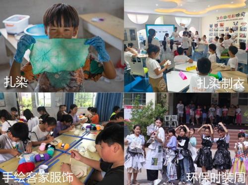在广东梅州,融合客家服饰中的蓝染技艺,开设“手绘客家服饰”课程,让孩子们在笔触与色彩间感受传统文化魅力;在贵州黔东南,充分利用当地竹、麻资源,带领孩子们制作简易纺织工具,亲身体验手工纺织的乐趣;在安徽六安,发起“环保时装周”活动,引导孩子们关注生态保护与可持续发展。这种“专业+支教”的创新模式,不仅让山区的孩子接触到前沿的纺织知识与前沿科技,也让江大纺院学子在实践中深化专业认知、锤炼创新能力,吸引众多跨专业学生参与其中,真切感受纺织学科的多元魅力,真正实现了知行合一、教学相长。