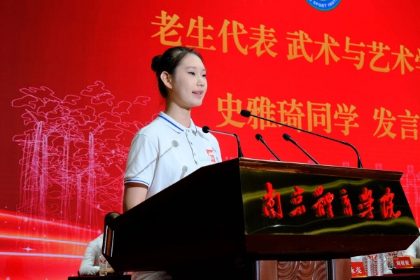 武术与艺术学院史雅琦同学代表在校生发言。她分享了三点感悟:别害怕“试错”,记得“守住节奏”,别忘了“主动求助”
