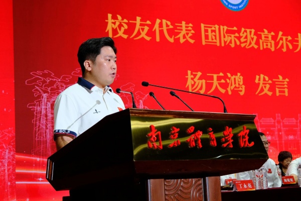 2013届运动训练专业高尔夫专项校友杨天鸿代表校友发言。他表示,母校“严、和、朴、实”的校训,南体人“艰苦创业、乐于奉献、团结拼搏、勇攀高峰”的精神是自己前行的力量。他鼓励同学们站在充满机遇的新时代,要珍惜在校时光,沉心学习,为未来打下坚实基础。