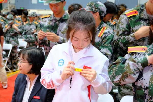 出席典礼的校党委领导班子成员为新生代表颁发校徽。随后,2025级全体同学起立,一同佩戴校徽。此刻起,南体校徽成为同学们的新身份标识;戴上校徽,大家正式成为一名南体人,肩负起延续母校荣光的责任与使命。