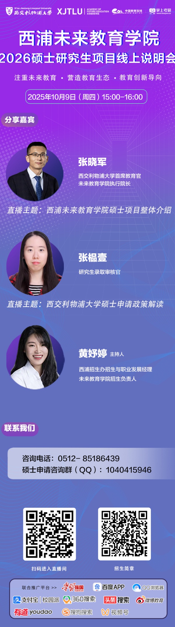 10月9日15:00-16:00,西交利物浦大学未来教育学院将在线上举办2026硕士研究生项目线上说明会(活动详情请见下方海报)。