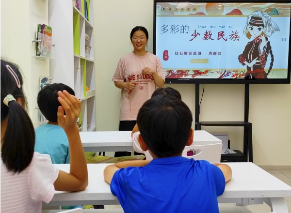 江苏徐州的课堂上,队员用各种形式展示贵州喀斯特地貌,为即将研学的小朋友讲解当地苗族、布依族风俗,“吊脚楼”“银饰”等词汇搭配图片教学。