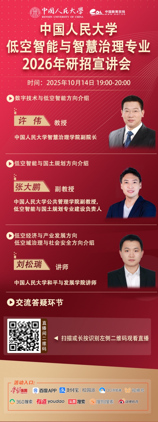 直播预告|10月14日,中国人民大学低空智能与智慧治理专业2026研究生招生咨询会邀您参与