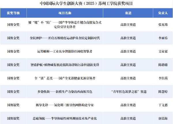 苏州工学院共斩获国赛金奖6项、银奖2项,获奖总数、金奖总数均创历史新高,金奖数与清华大学、华南理工大学和四川大学并列全国第十一。本次比赛是苏州工学院师生首次代表“苏州工学院”出征,首次实现高教主赛道金奖“零”突破,同时,实现了红旅赛道连续三年金奖不断线。