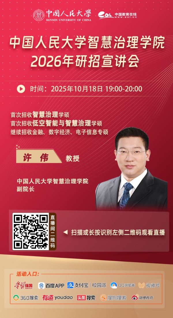 10月18日19:00-20:00,中国人民大学智慧治理学院将在线上举办2026研究生招生咨询会(活动详情请见下方海报)。