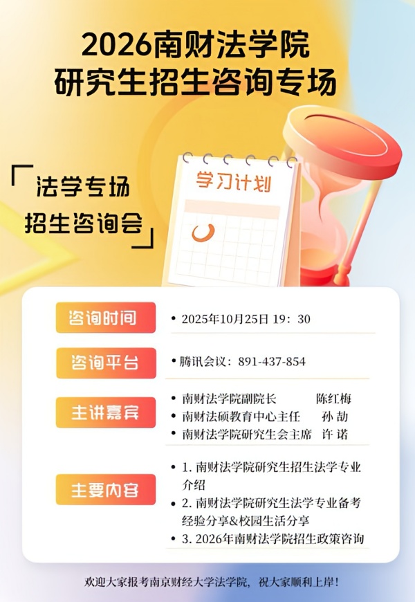 10月25日,南京财经大学法学院将在线上举办2026研究生招生咨询专场。