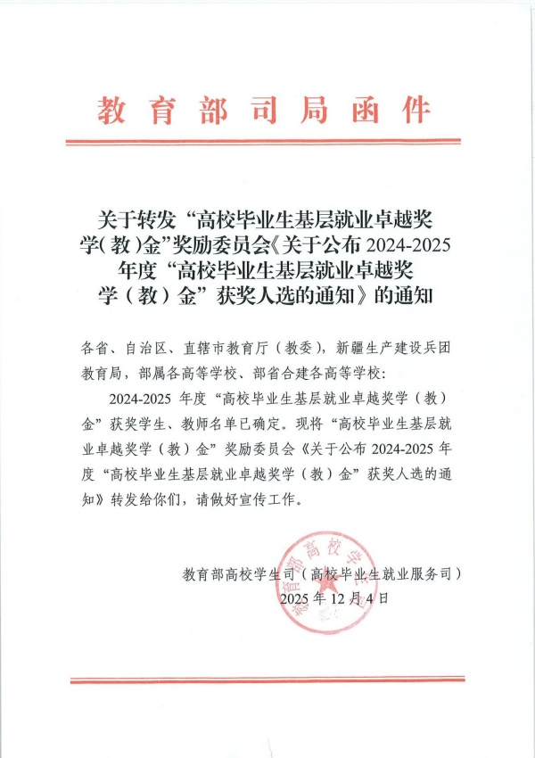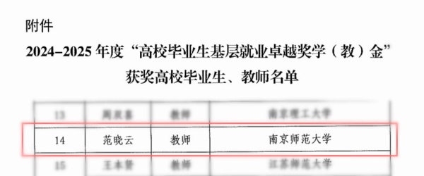 南京师范大学教师荣获2024-2025年度“高校毕业生基层就业卓越奖教金”