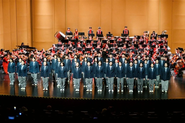 音乐会以中国药科大学交响乐团严岩教授指挥的《红旗颂》拉开帷幕,恢弘旋律点燃全场,诠释红色信仰的磅礴力量。随后,《茉莉飘香》勾勒江淮风韵,尽显淮安地域文化特色;专为纪念周恩来总理奏响的《雪里梅园》,以浪漫笔触演绎梅花品格,回望伟人精神光芒。演出中,配乐朗诵《以爱为弦 和鸣岁月》融合文字与旋律,诉说家国情怀;《祖国,慈祥的母亲》《万泉河水清又清》等经典曲目轮番唱响,传递对祖国的热爱与对峥嵘岁月的回望。其间,江苏省淮阴中学交响乐团单独登场,先后演绎《北京喜讯到边寨》与《e小调第九交响曲“自新世界”》第四乐章两首经典曲目。音乐会在全场合唱《歌唱祖国》中落幕,歌声与掌声交织,久久回荡。两校学子以饱满热情和专业表现,展现了新时代青年的艺术素养与精神风貌。