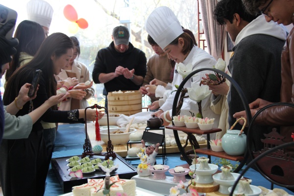 “决定做一件事,就要能吃苦;做一行,爱一行”。十八岁时,张福香凭借对淮扬早茶的浓厚兴趣与灵巧手艺,被师傅引荐进入富春茶社。学艺的日子颇为艰辛,每天凌晨四点就要起身准备包子的面剂与馅料。在每一次揉面、捏制的过程中,张大师深切感受到师傅传承下来的匠心与品德,从而更加坚定了将富春早茶文化推陈出新的决心。在继承三丁包、翡翠烧卖与千层油糕等经典技艺的基础上,张大师始终坚持以传承为本、以创新为魂,不断适应时代与消费者的需求。张大师向队员们展示了绿杨春酥、海棠酥、龙虾酥、足球酥、百合酥等一系列新颖茶点,这些点心既保留了传统风味,又兼具观赏与实用性。