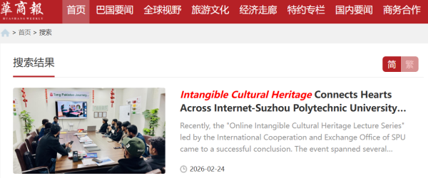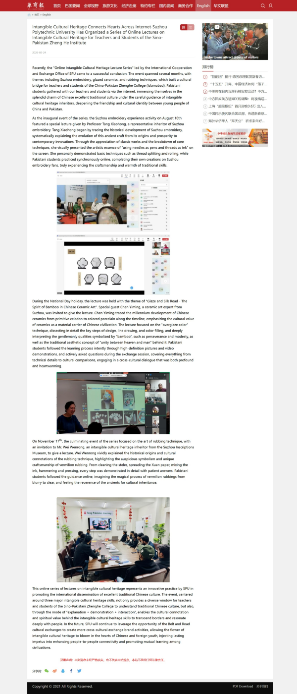 近日,苏州职业技术大学面向中巴郑和学院(伊斯兰堡)师生开展的“线上非物质文化遗产系列讲座”圆满落幕。这场历时数月、以苏绣、釉上彩陶瓷和碑拓技艺为主题的文化交流活动,不仅让巴基斯坦国家技术大学的师生沉浸式体验了中华优秀传统文化的独特魅力,更引发巴基斯坦主流媒体的广泛关注与高度评价。巴基斯坦知名媒体《华商报》以《非物质文化遗产跨越网络连接心灵》为题独家报道了该系列活动,盛赞活动通过“云端”打破时空界限,为中巴人文交流注入新的活力,是“一带一路”框架下民心相通的生动实践。